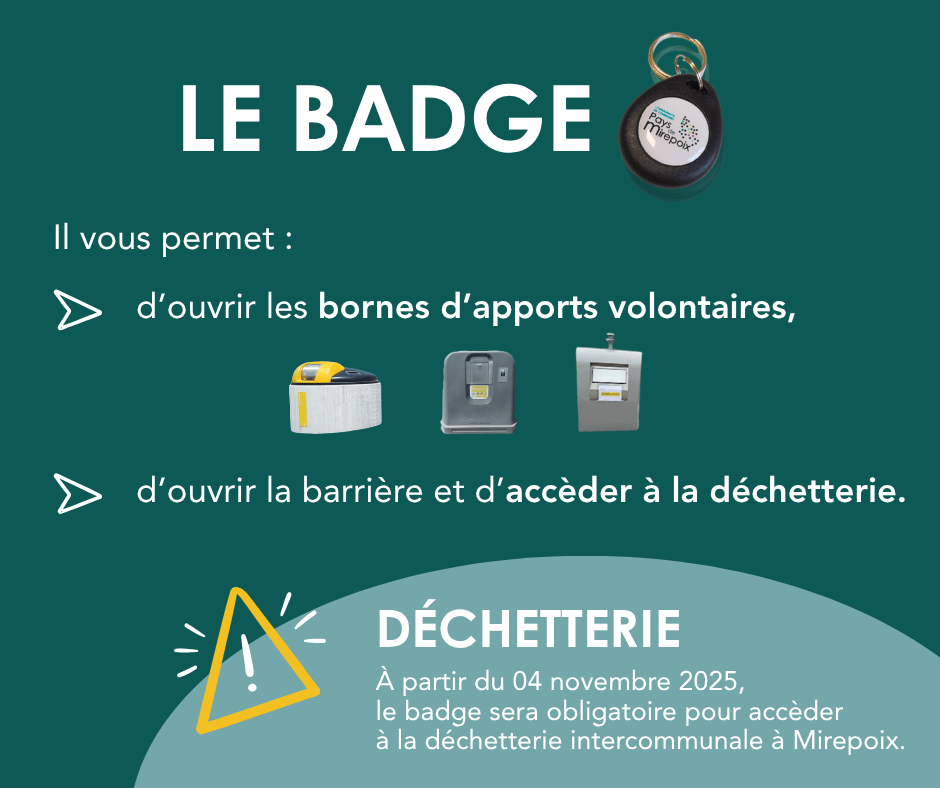 Pour pouvoir déposer des déchets, il sera désormais obligatoire d’être munis d’un badge nominatif (sauf dépôts ponctuels) à récupérer à l’accueil du siège de la CCPM (30 Cours du Maréchal de Mirepoix – 09500 Mirepoix), du lundi au mercredi de 8h30 à 12h00 et de 13h30 à 17h00.
